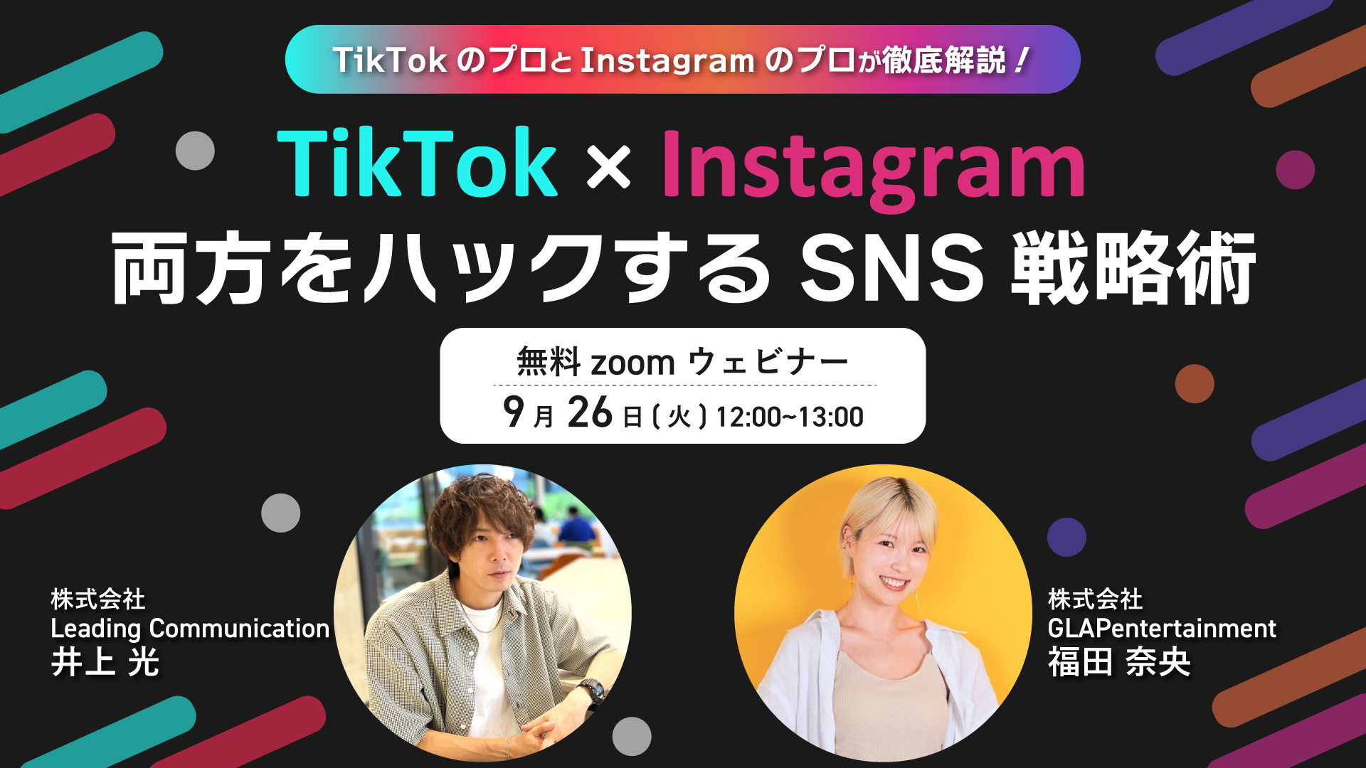 株式会社Leading Communication(本社:東京都渋谷区、代表取締役社⻑:細矢義明 以下、LC)は、株式会社GLAPentertainment(本社:東京都渋谷区、代表取締役: 坂本大輔 )と共同で、『TikTokとInstagramの両方を効果的に運用するための方法』について、無料ウェビナーを開催致します。