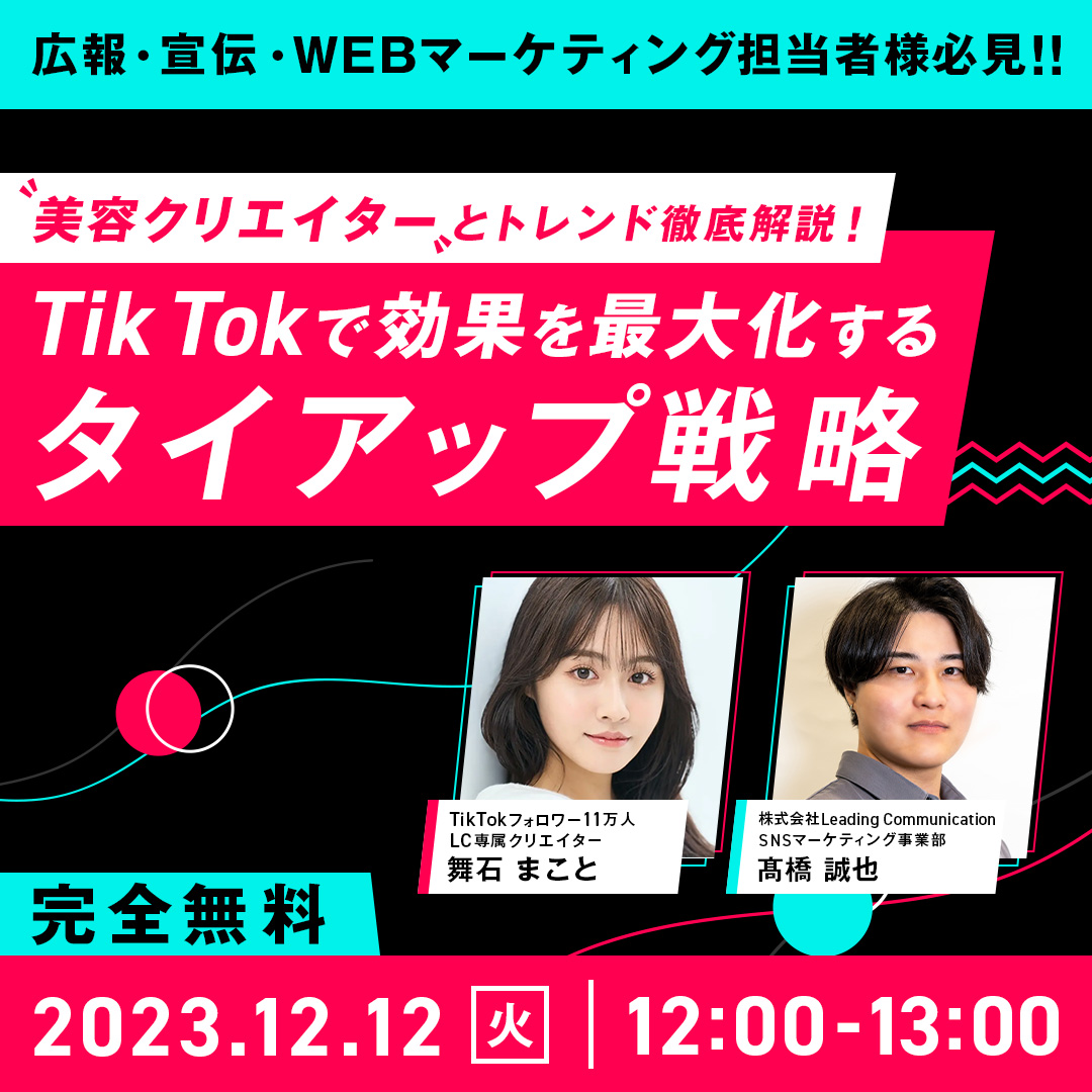 美容クリエイター舞石まこと氏をゲストにお迎えし、広告・宣伝・Webマーケティング担当者様を対象に、「”美容クリエイターとトレンド徹底解説!” TikTokで効果を最大化するタイアップ戦略」を、2023年12月12日(火) に開催いたします。講演は、LC の髙橋誠也が務めます。